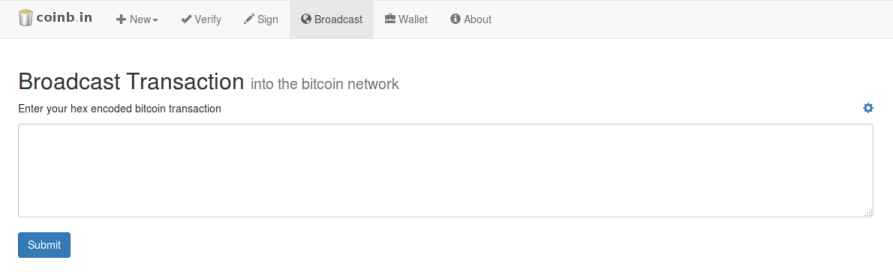 Infine cambiate ancora tab nel menu in alto cliccando su Broadcast. Incollate nella casella di testo la signed transaction ottenuta nella pagina precedente e cliccate su Submit. Si otterrà così il txid che è l'id della transazione che è stata appena "pushata" sul network.